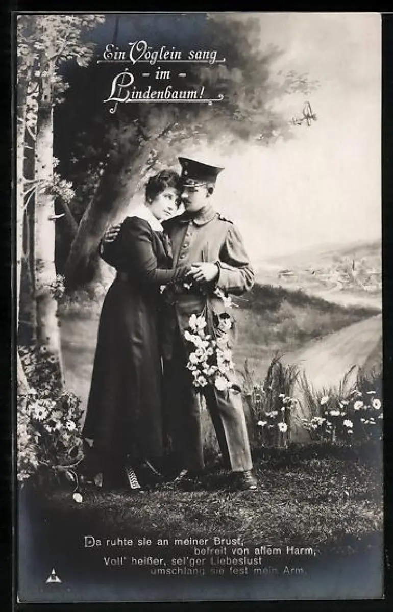 AK Ein Vöglein sang im Lindenbaum, Soldat umarmt sein Mädchen zum Abschied