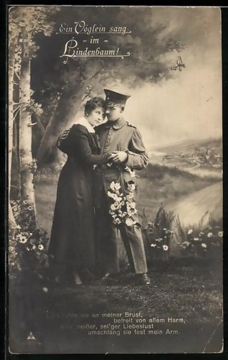 AK Ein Vöglein sang im Lindenbaum, Soldat umarmt sein Mädchen zum Abschied