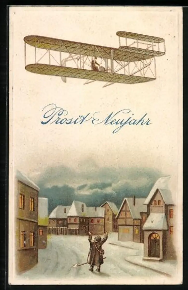 AK Ein frohes Neujahr, einfältiger Nachtwächter erschrickt vor einem Flugzeug