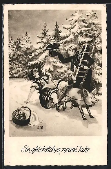 AK Ein glückliches neues Jahr, der Schornsteinfeger bietet einem Mädchen seine Hilfe an, Glücksschwein