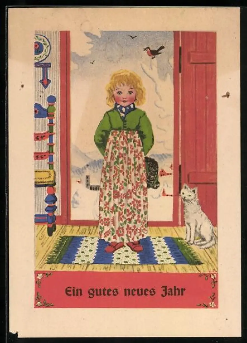 AK Ein gutes neues Jahr Mädchen mit Blumenrock und weisser Katze an der Tür
