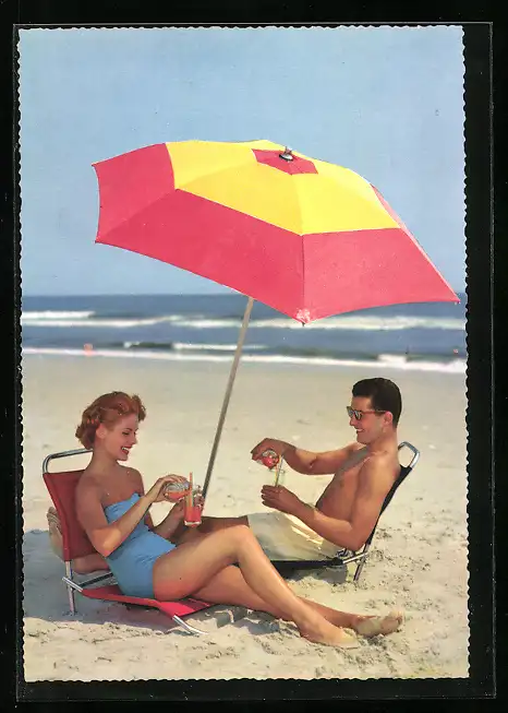 AK Ein junges Paar in Bademode unterm Sonnenschirm