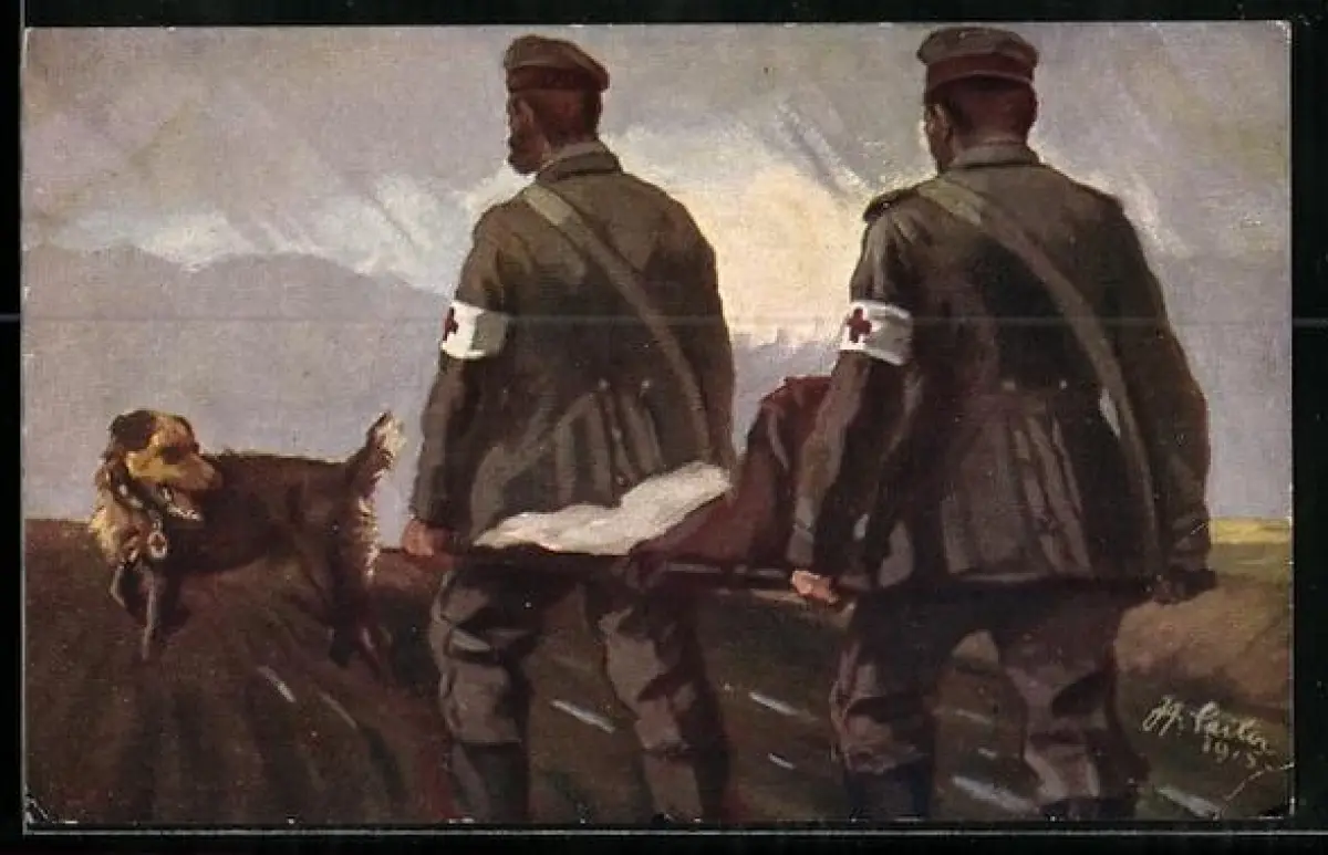 AK Ein vom Sanitätshund in einem vergessenen Geländewinkel entdeckter Schwerverwundeter auf dem Wege ins Feldlazarett