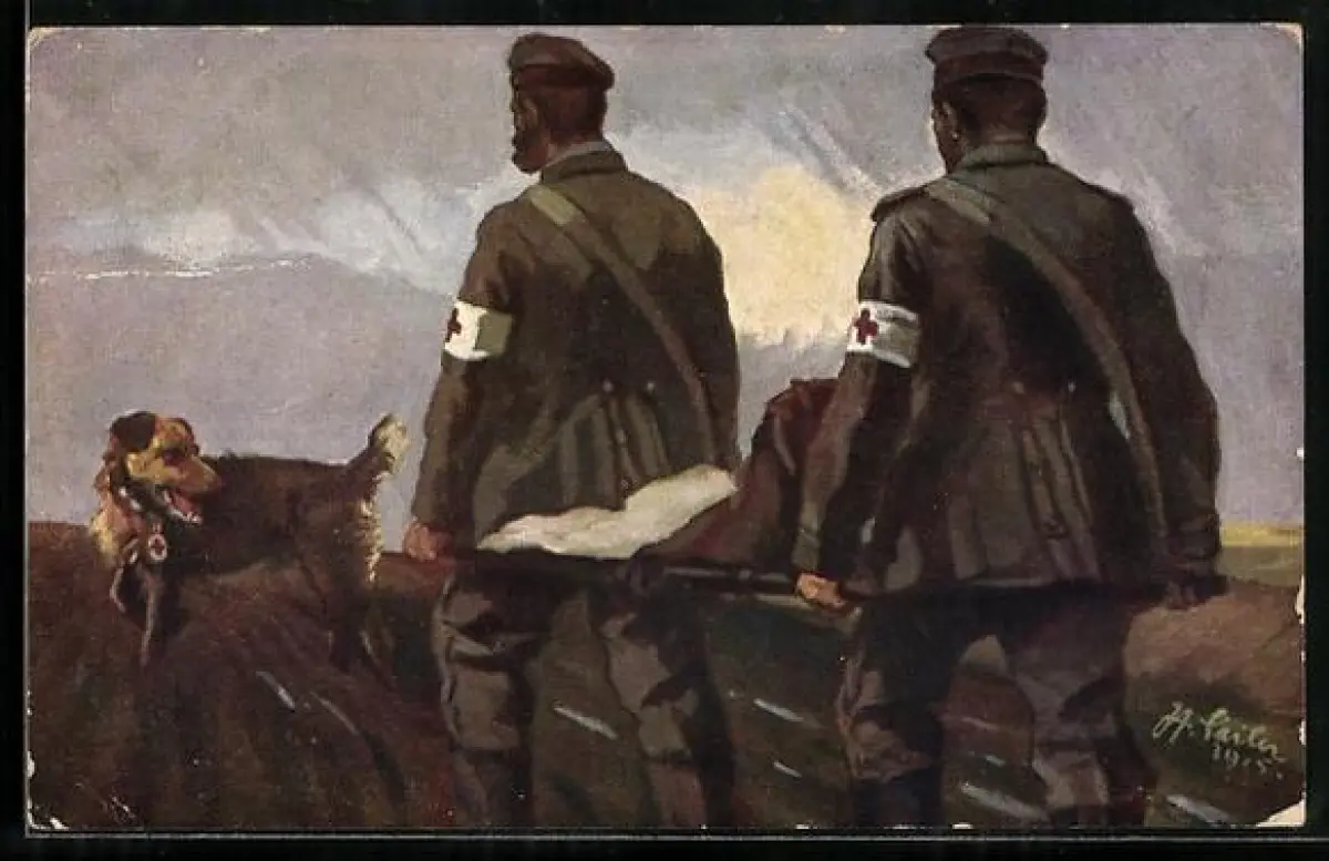 AK Ein vom Sanitätshund in einem vergessenen Geländewinkel entdeckter Schwerverwundeter auf dem Wege ins Feldlazarett