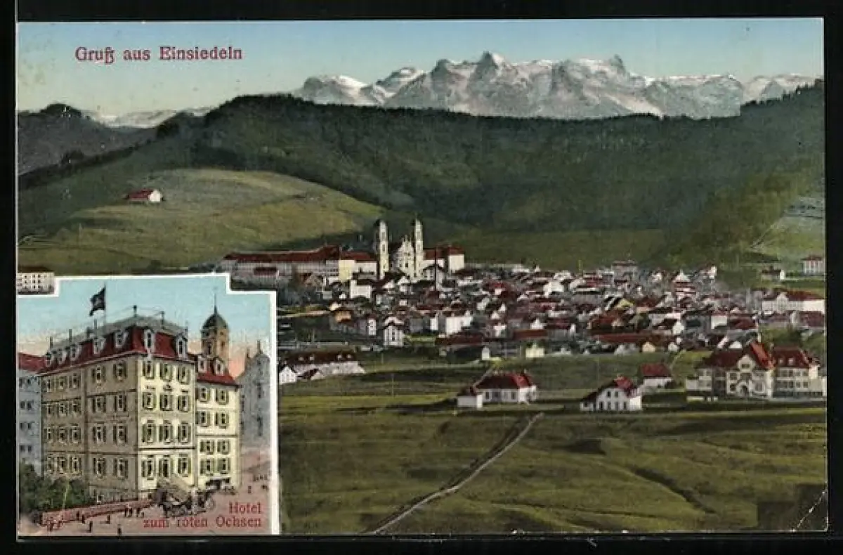 AK Einsiedeln, Hotel zum roten Ochsen, Teilansicht mit Kloster