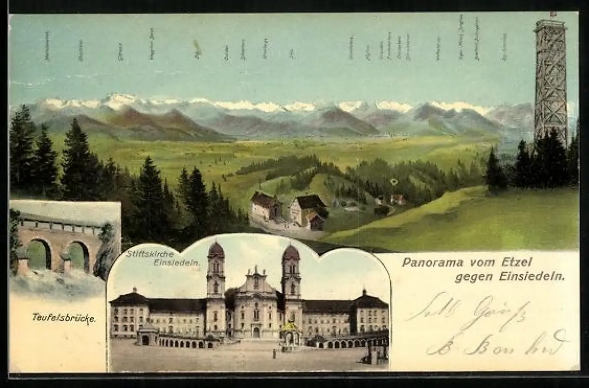 AK Einsiedeln, Stiftskirche, Teufelsbrücke, Panorama vom Etzel aus gesehen