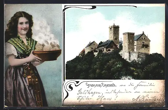 AK Eisenach, Blick zur Wartburg, Frau mit einer Schüssel Knödel