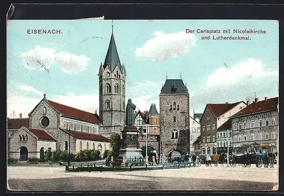 AK Eisenach, Der Carlsplatz mit Nicolaikirche und Lutherdenkmal, Hotel Karthäuserhof
