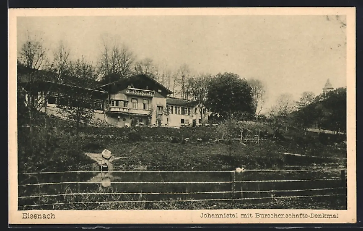AK Eisenach, Gasthof zur Waldschänke, Johannistal mit Burschenschafts-Denkmal
