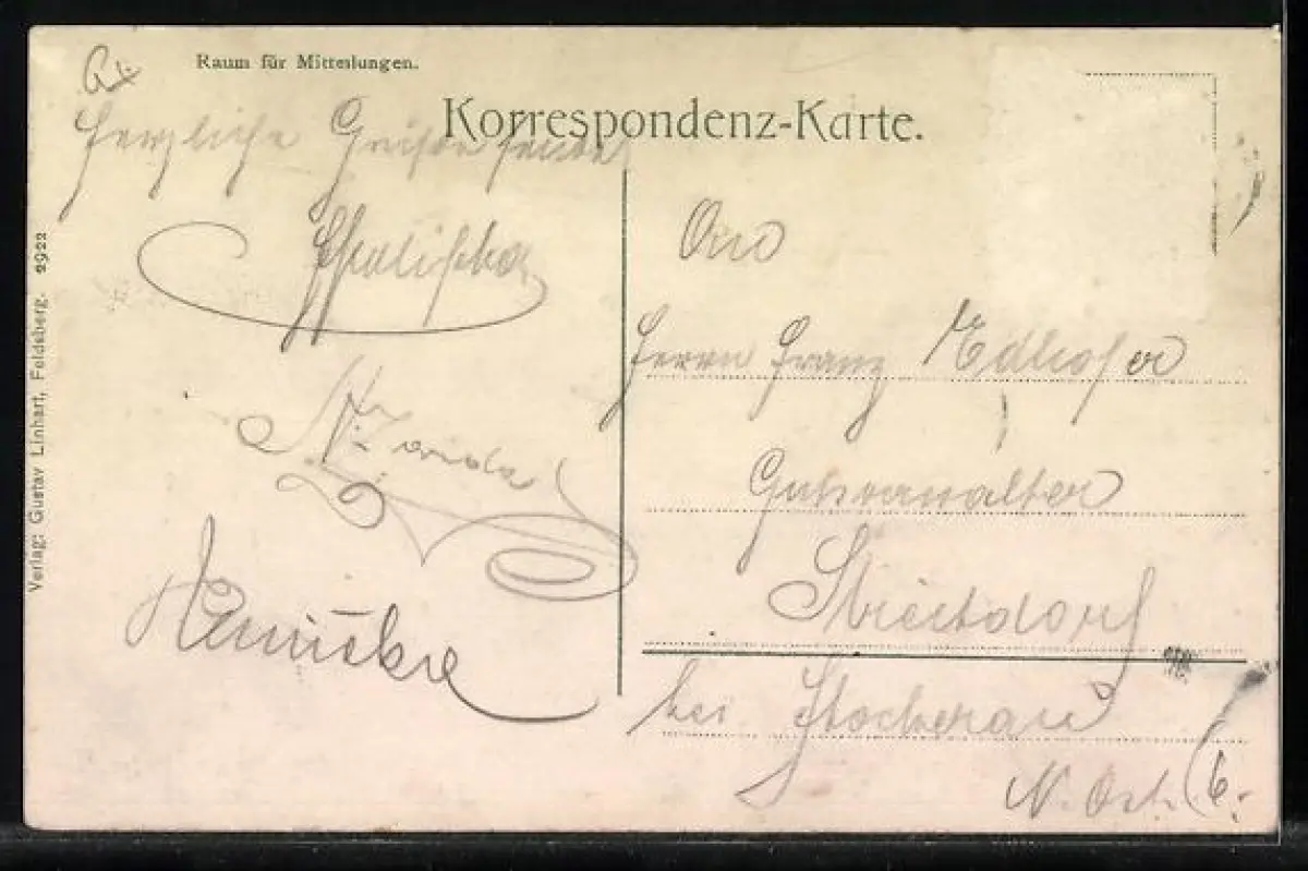 Personenbezogene Daten auf der Rückseite der Karte wurden durch blauen Textmarker unkenntlich gemacht. Die blauen Stellen sind auf die Vorderseite durchgeweicht und wirken sich negativ auf das Postkartenfoto aus