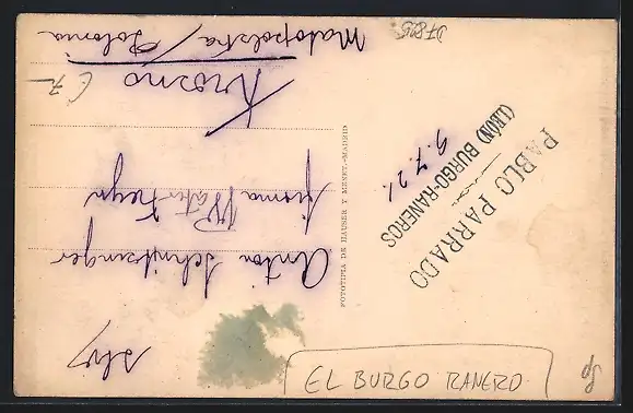 Personenbezogene Daten auf der Rückseite der Karte wurden durch blauen Textmarker unkenntlich gemacht. Die blauen Stellen sind auf die Vorderseite durchgeweicht und wirken sich negativ auf das Postkartenfoto aus