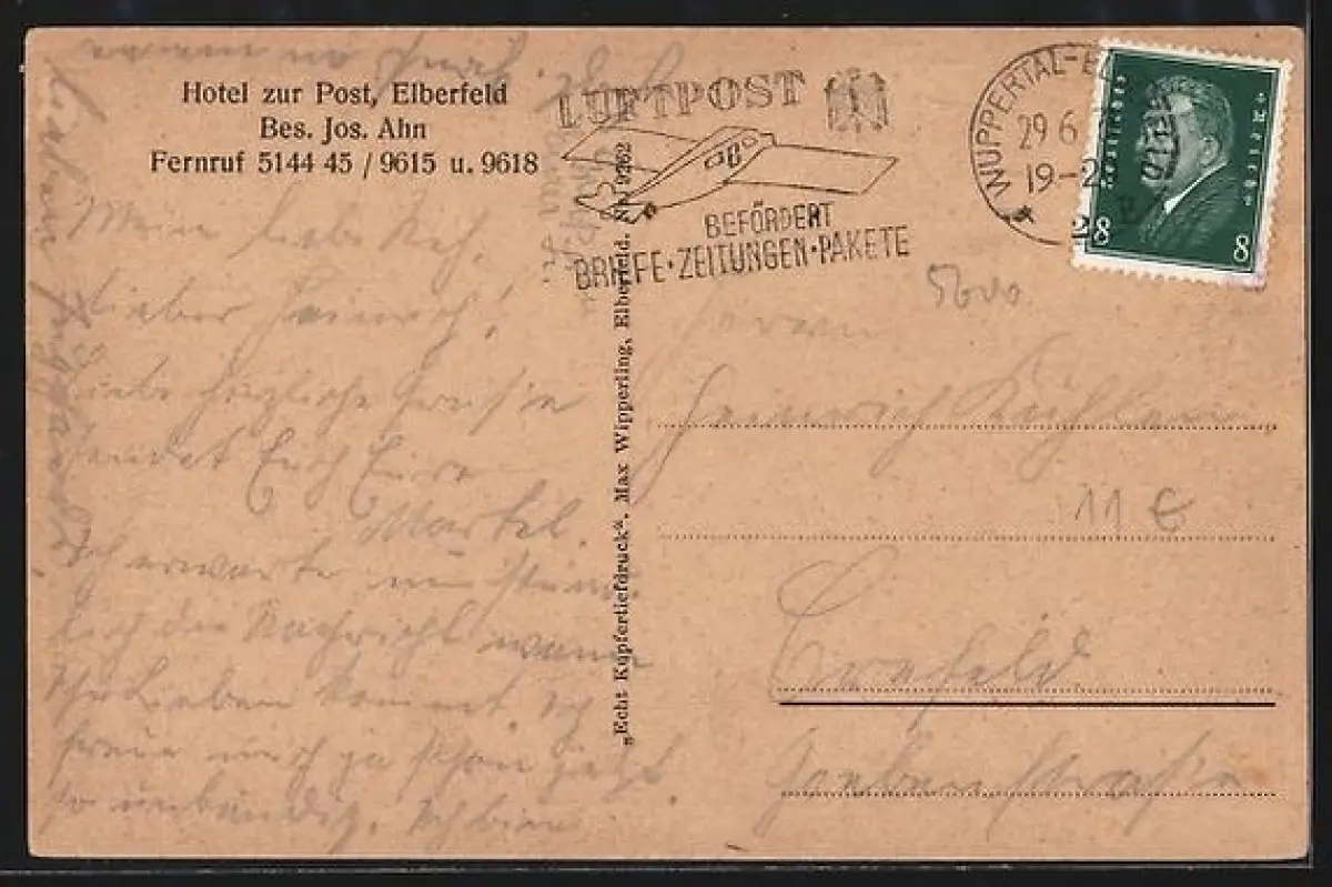 AK Elberfeld, Hotel zur Post, Speisesaal, Bes. Jos. Ahn