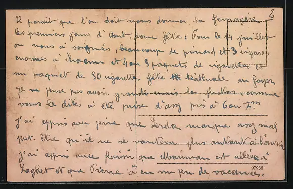Personenbezogene Daten auf der Rückseite der Karte wurden durch blauen Textmarker unkenntlich gemacht. Die blauen Stellen sind auf die Vorderseite durchgeweicht und wirken sich negativ auf das Postkartenfoto aus