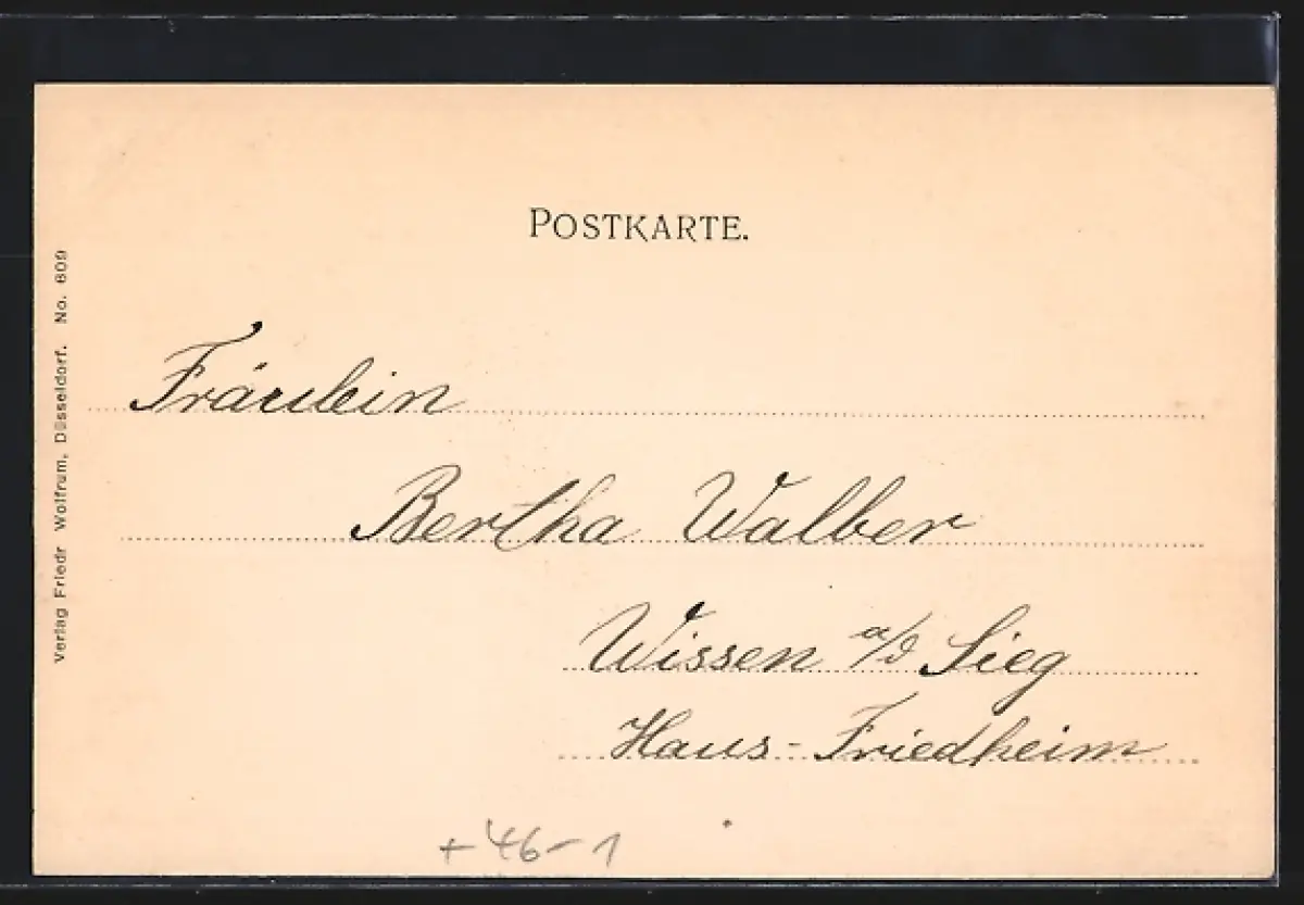 Personenbezogene Daten auf der Rückseite der Karte wurden durch blauen Textmarker unkenntlich gemacht. Die blauen Stellen sind auf die Vorderseite durchgeweicht und wirken sich negativ auf das Postkartenfoto aus