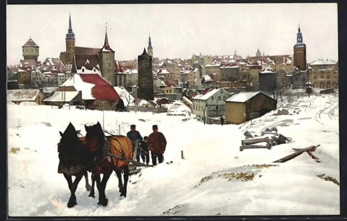 AK Elbing, Winteransicht mit Stadtmauer, Kirchtürmen und Pferdeschlitten