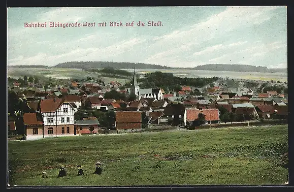 AK Elbingerode, Blick vom Bahnhof auf die Stadt, Leute auf der Wiese
