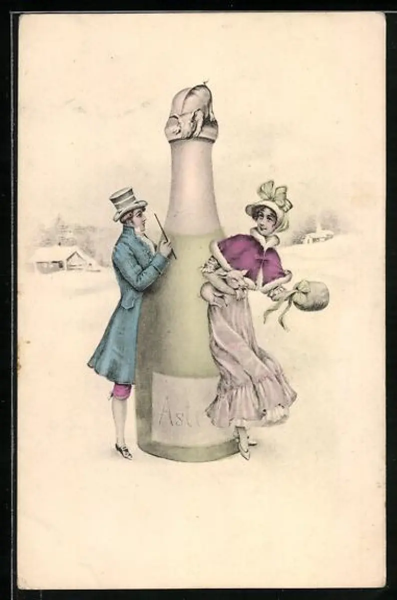 AK Elegant gekleideter Herr und Frau mit grosser Weinflasche