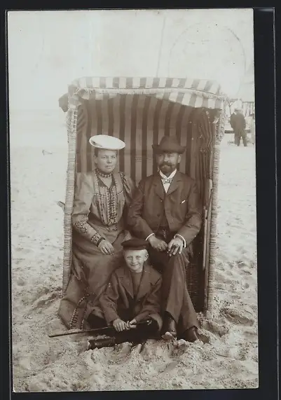 AK Elegant gekleidetes Ehepaar mit Sohn in einem Strandkorb