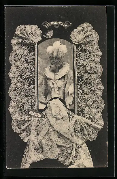 AK Elegante Dame präsentiert die wertvolle Handarbeit der Spitzenklöppelei
