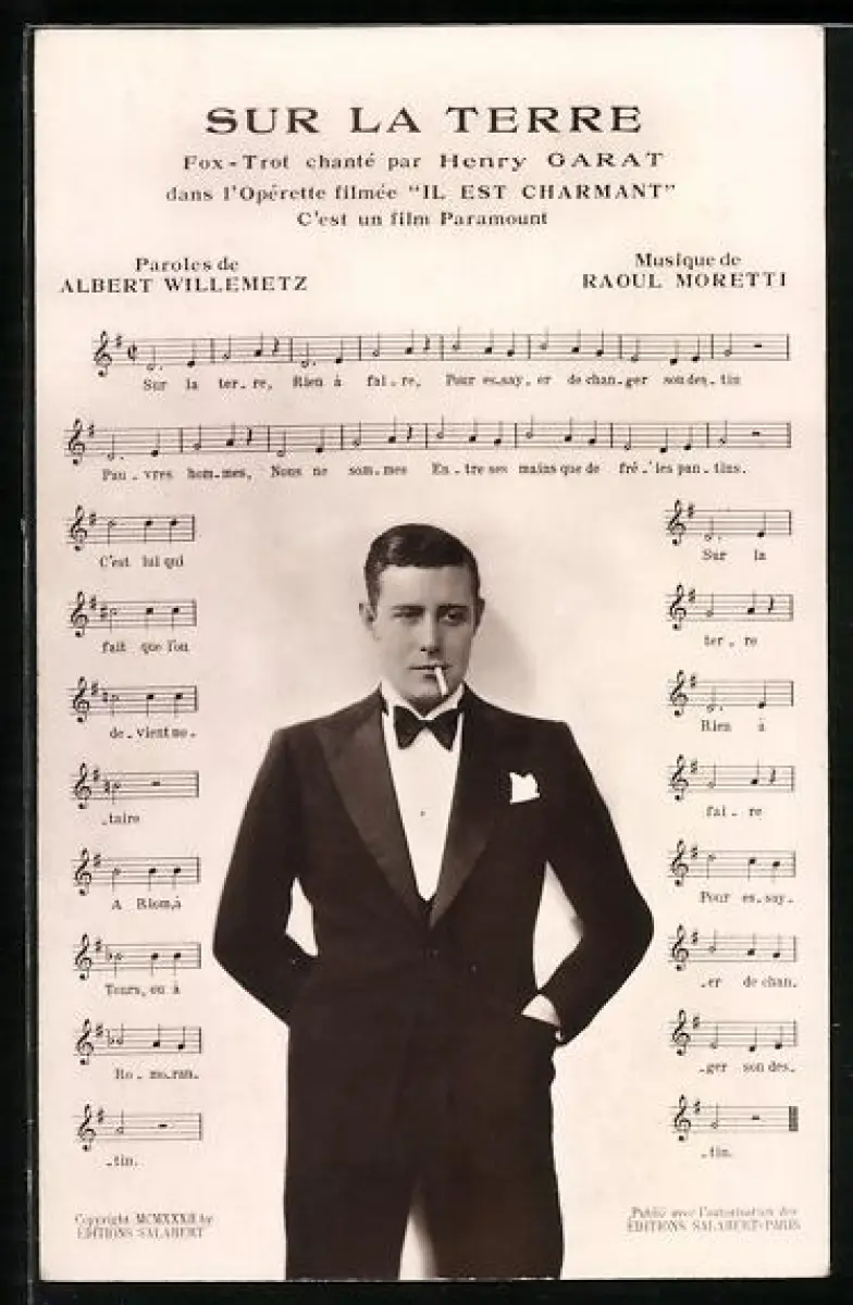 AK Eleganter Herr mit Zigarette, Sur la Terre, Lied mit Noten