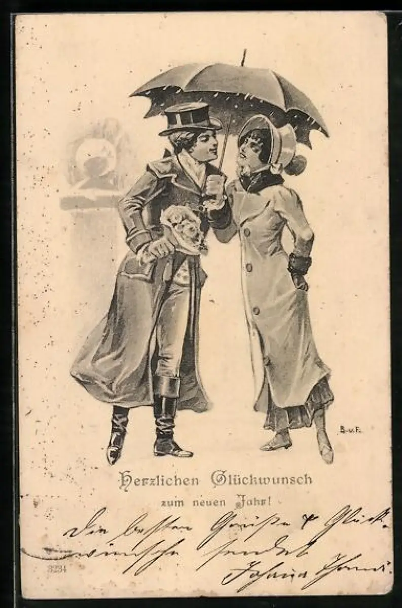 AK Elegantes Paar mit Blumen und mit Schirm im Regen, Neujahrsgruss