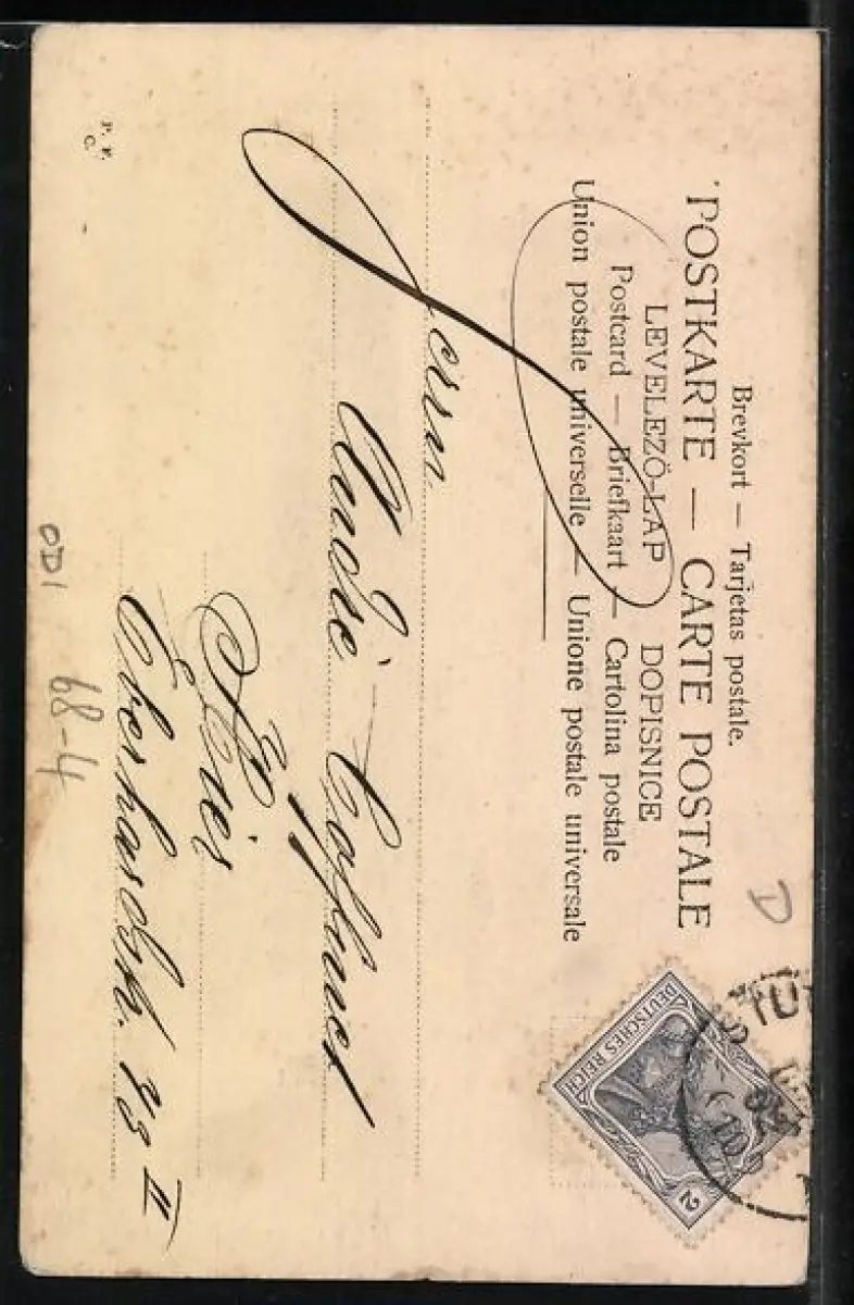 Personenbezogene Daten auf der Rückseite der Karte wurden durch blauen Textmarker unkenntlich gemacht. Die blauen Stellen sind auf die Vorderseite durchgeweicht und wirken sich negativ auf das Postkartenfoto aus