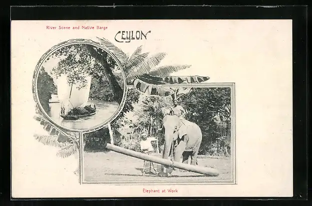 AK Elephant at Work, River Scene and Native Barge