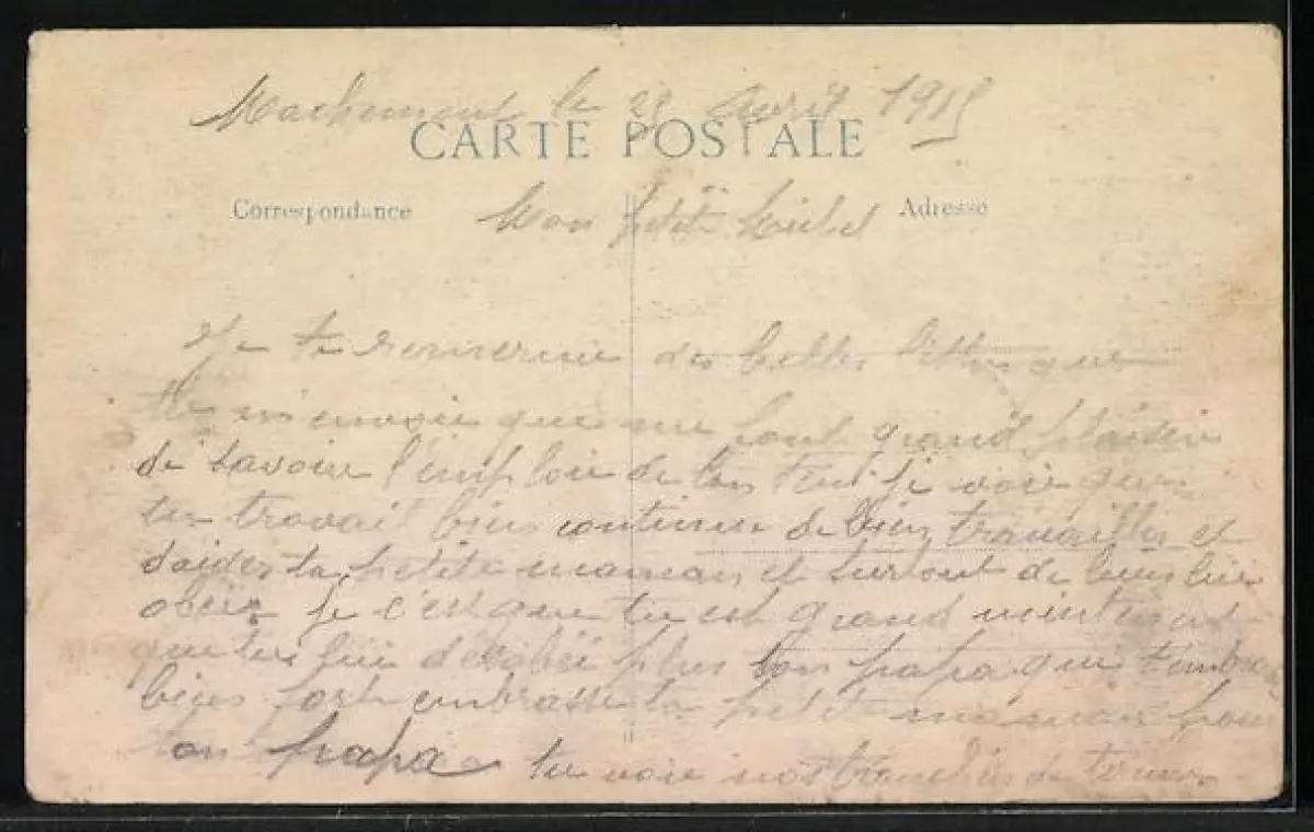 Personenbezogene Daten auf der Rückseite der Karte wurden durch blauen Textmarker unkenntlich gemacht. Die blauen Stellen sind auf die Vorderseite durchgeweicht und wirken sich negativ auf das Postkartenfoto aus