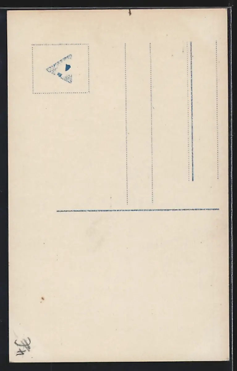 Personenbezogene Daten auf der Rückseite der Karte wurden durch blauen Textmarker unkenntlich gemacht. Die blauen Stellen sind auf die Vorderseite durchgeweicht und wirken sich negativ auf das Postkartenfoto aus