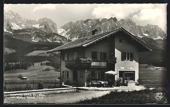 AK Ellmau, Landhaus Anna mit Geschäft Schuhmacher Fill, Ansicht gegen Wilden Kaiser