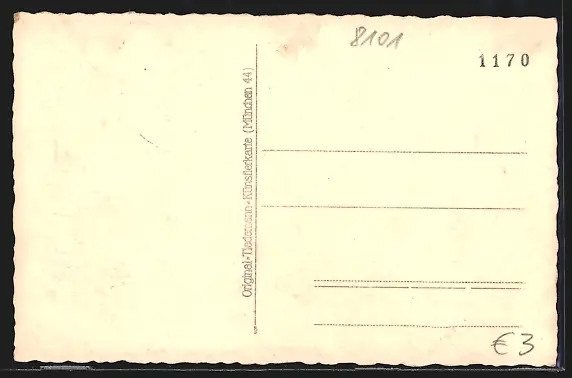 Personenbezogene Daten auf der Rückseite der Karte wurden durch blauen Textmarker unkenntlich gemacht. Die blauen Stellen sind auf die Vorderseite durchgeweicht und wirken sich negativ auf das Postkartenfoto aus