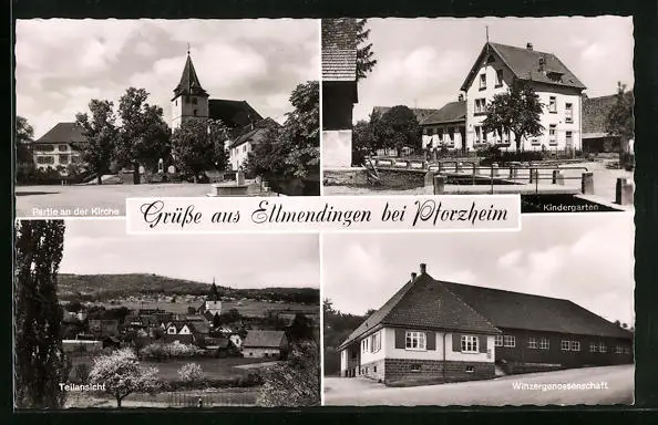 AK Ellmendingen /Pforzheim, Partie an der Kirche, Kindergarten, Teilansicht, Winzergenossenschaft