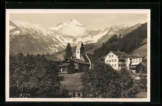 AK Elm, Ortspartie mit Kirche und Bergblick