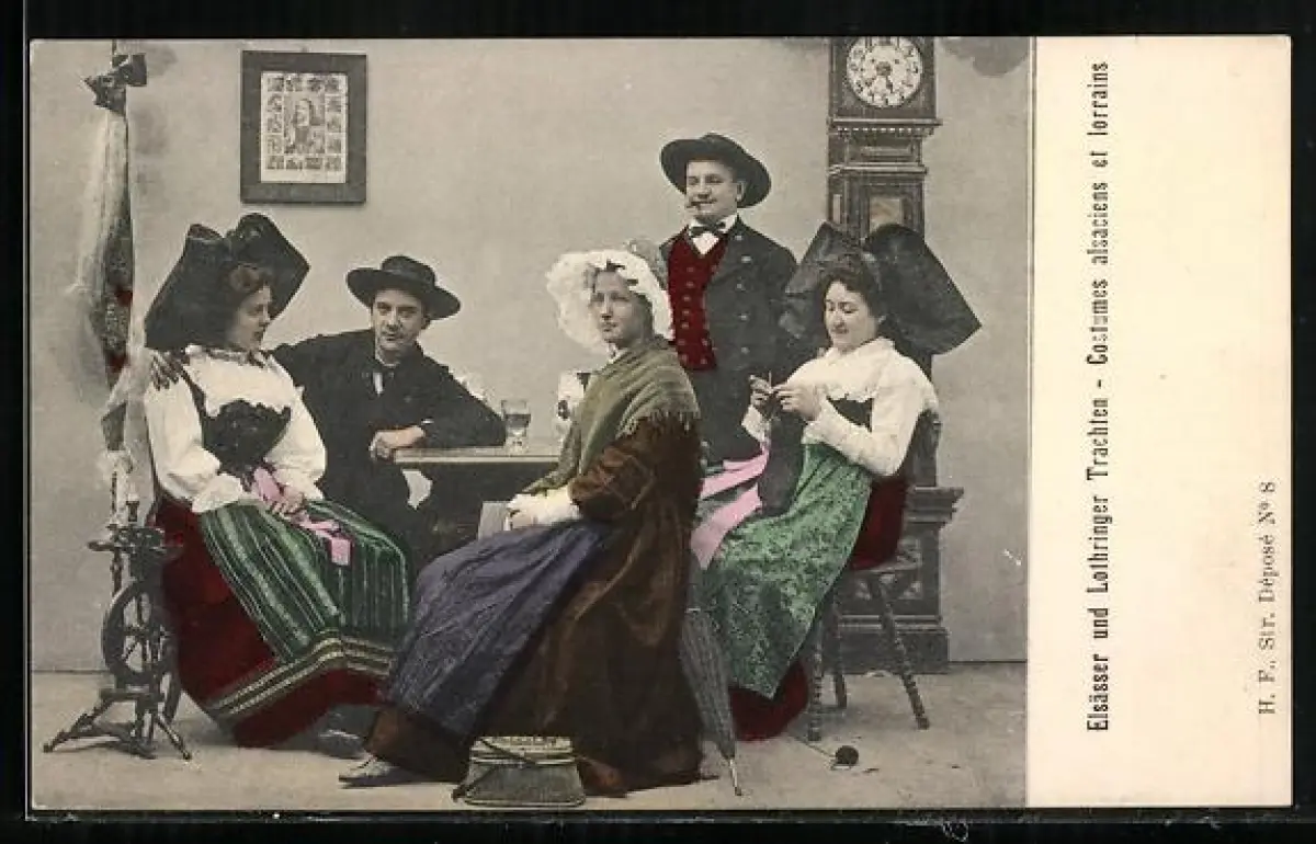 AK Elsässer und Lothringer Trachten, Männer und Frauen am Tisch