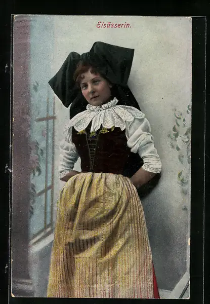 AK Elsässerin in Tracht lehnt lässig an der Wand