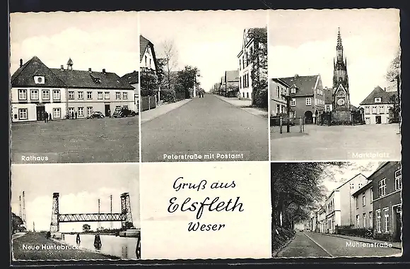 AK Elsfleth, Rathaus, Peterstrasse mit Postamt und Neue Huntebrücke