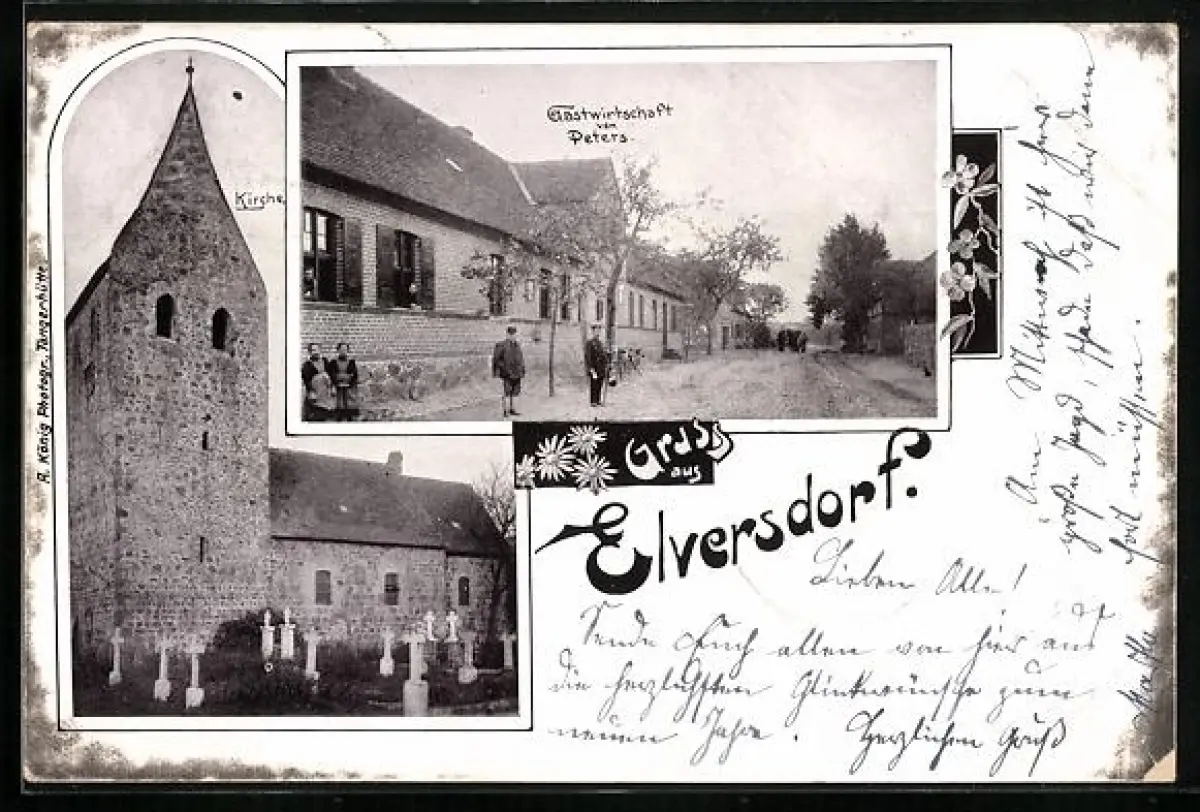 AK Elversdorf, Gasthaus von Peters, Kirche mit Friedhof