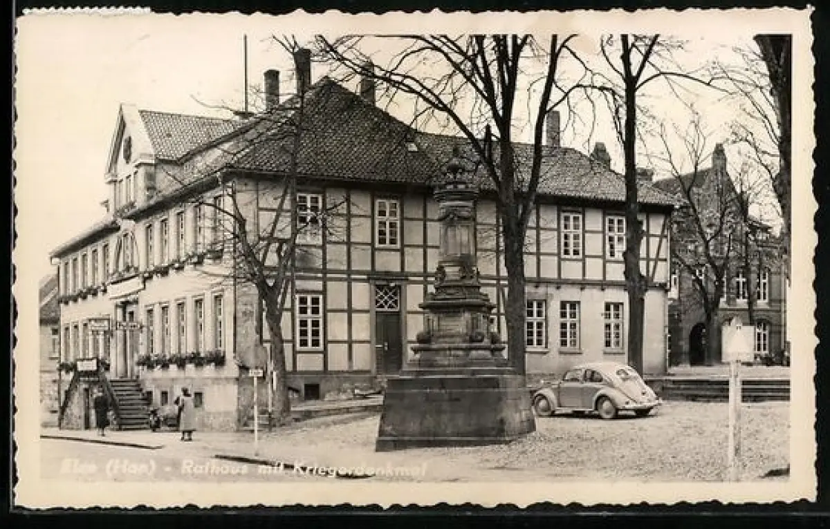 AK Elze /Han., Rathaus mit Kriegerdenkmal, VW Käfer