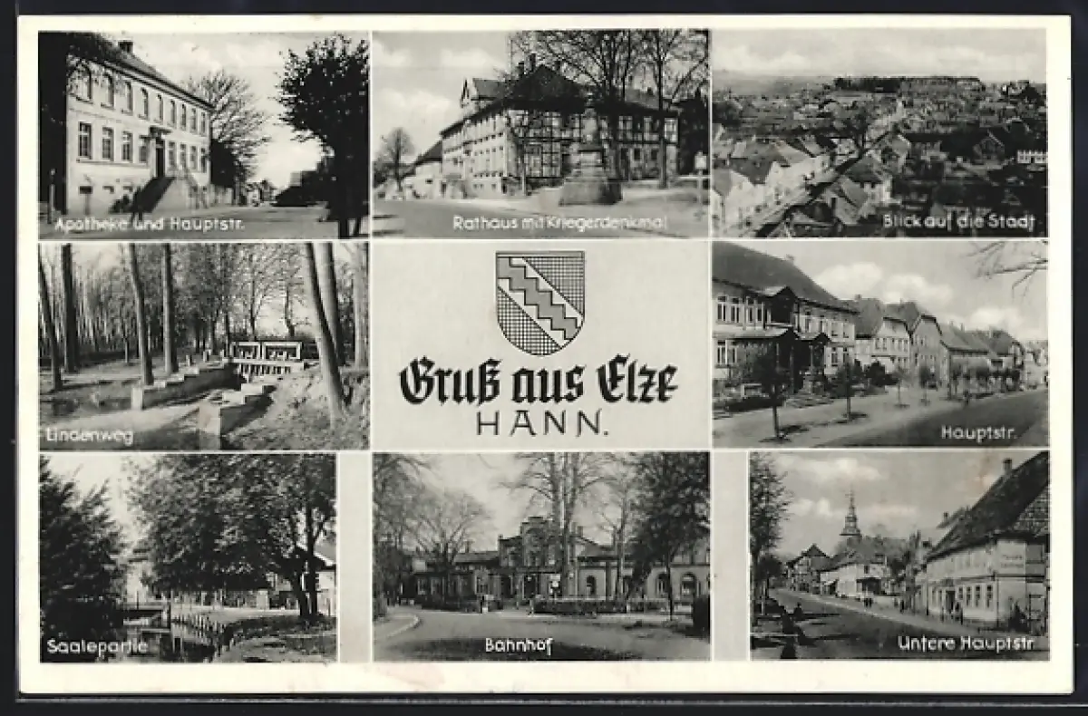 AK Elze /Hann., Apotheke und Hauptstr., Rathaus mit Kriegerdenkmal, Bahnhof, Saalepartie, Lindenweg