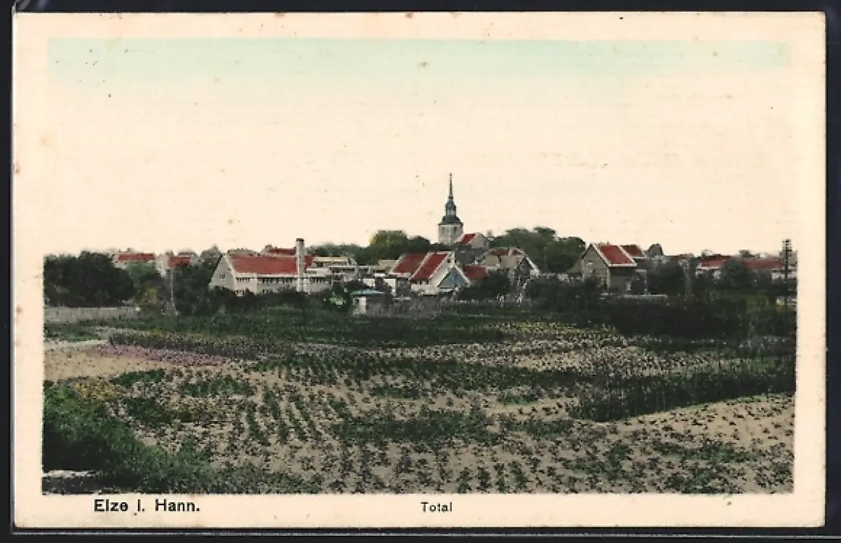 AK Elze i. Hann., Totalansicht des Ortes mit Kirche und Feldern