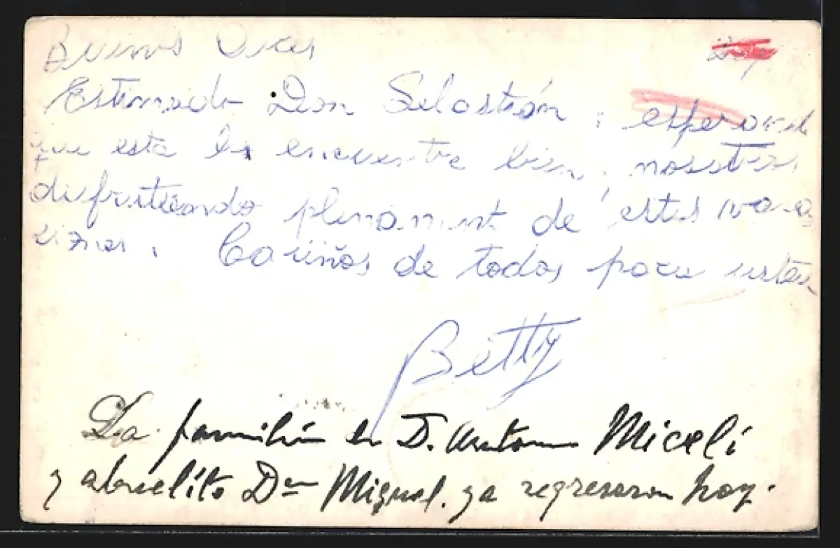 Personenbezogene Daten auf der Rückseite der Karte wurden durch blauen Textmarker unkenntlich gemacht. Die blauen Stellen sind auf die Vorderseite durchgeweicht und wirken sich negativ auf das Postkartenfoto aus