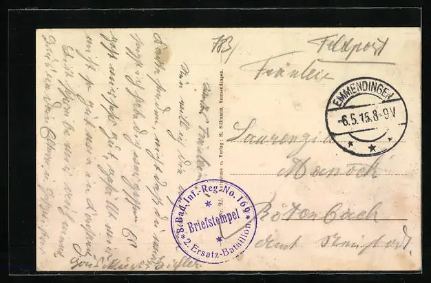 Personenbezogene Daten auf der Rückseite der Karte wurden durch blauen Textmarker unkenntlich gemacht. Die blauen Stellen sind auf die Vorderseite durchgeweicht und wirken sich negativ auf das Postkartenfoto aus