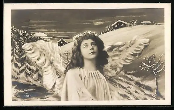 AK Engel mit Blumenkranz vor verschneitem Dorf