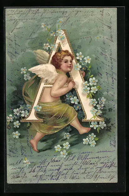 AK Engel mit Buchstabe A und Vergissmeinnicht