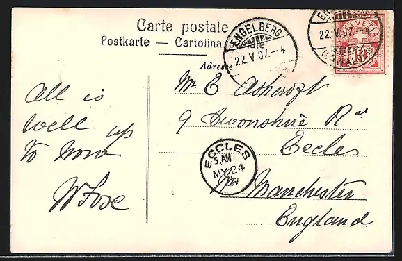 alte Ansichtskarte, gelaufen 1907, Stempelspur, guter Zustand