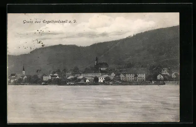 AK Engelhardszell a. D., Uferpartie mit Kirche