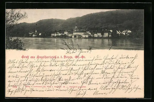 AK Engelhartszell a. d. Donau, Teilansicht mit Bergen