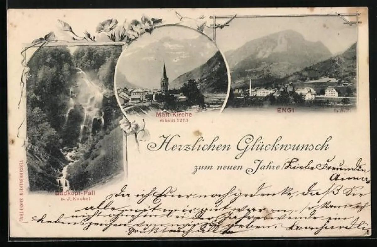 AK Engi, Ortsansicht, Matt-Kirche, Badkopf-Fall u. J. Knobel