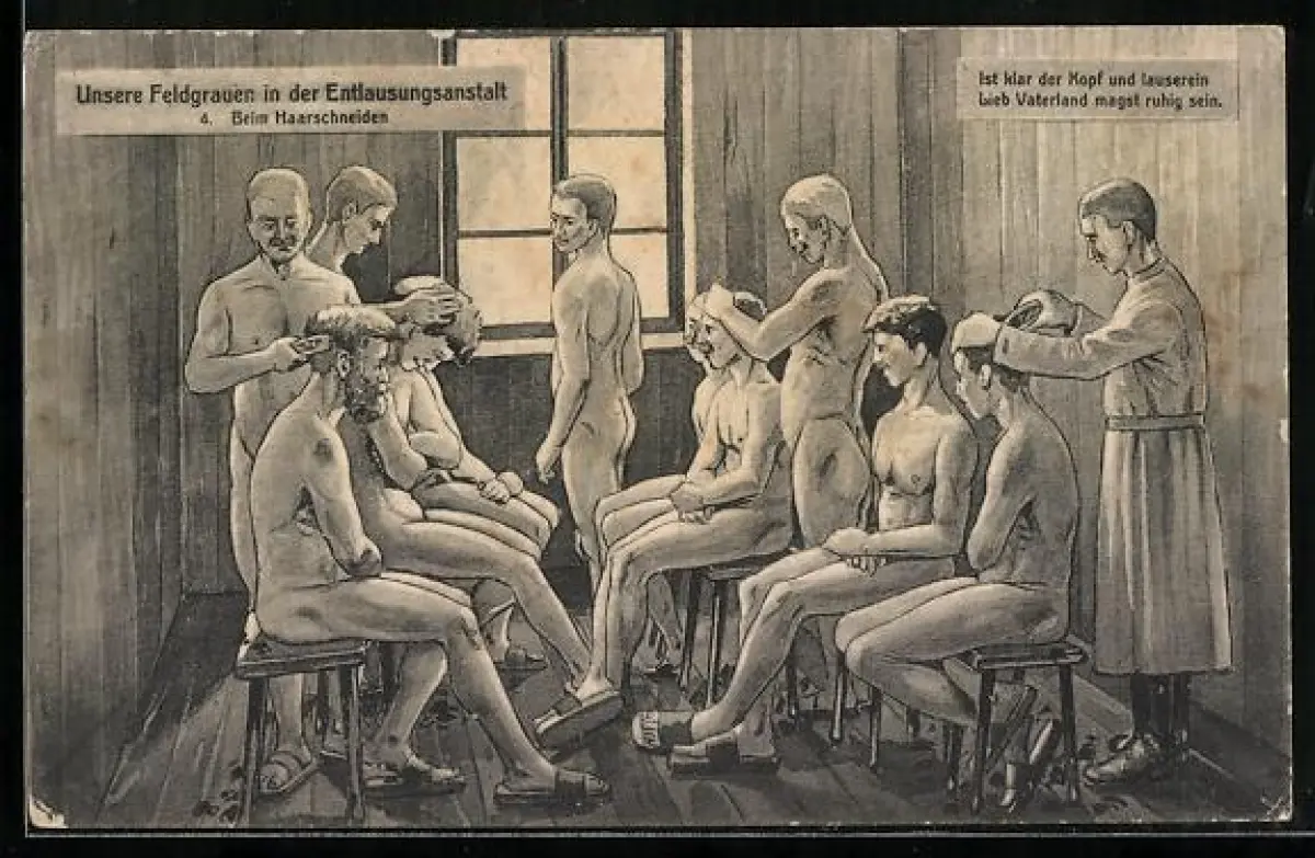 AK Entlausungsanstalt, nackten Soldaten werden die Haare geschnitten