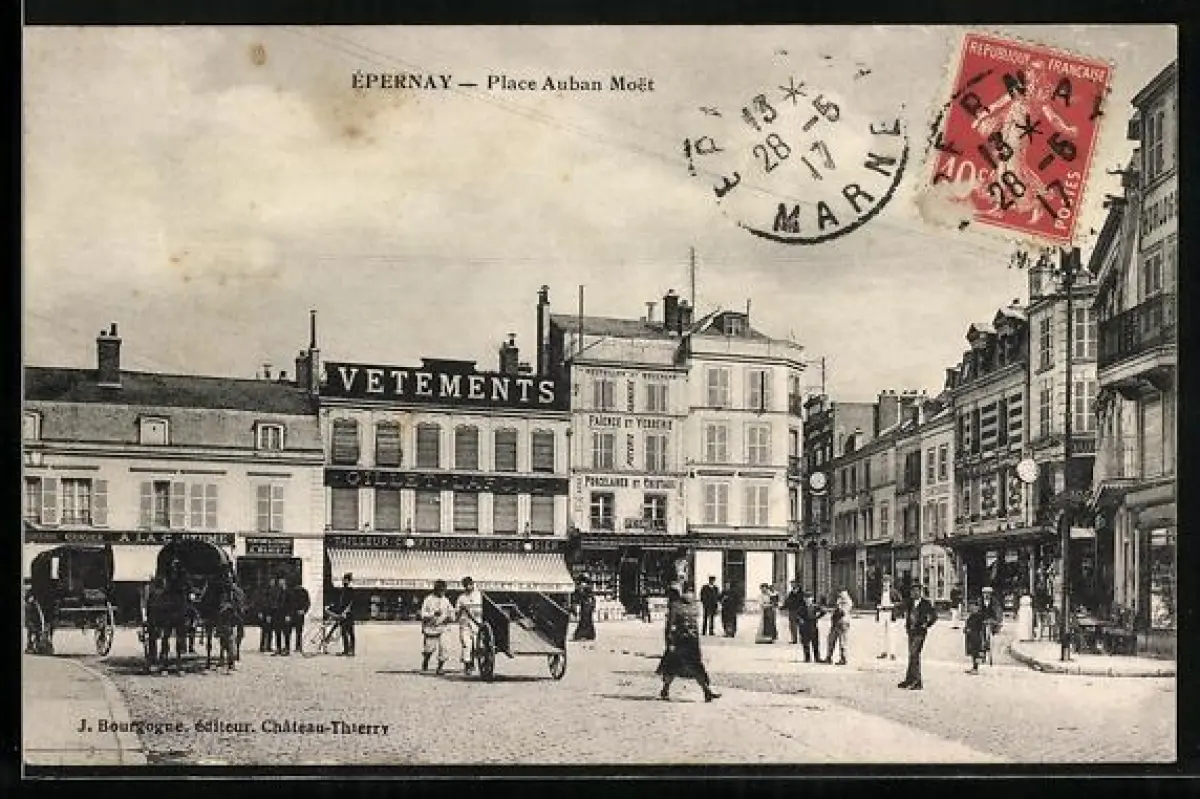 AK Épernay, Place Auban Moët avec passants et bâtiments commerciaux